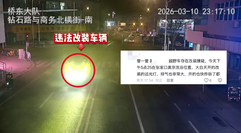 近日,張家口市公安局交通管理支隊接到網(wǎng)友舉報:在奧京洗浴附近有一輛非法加裝車燈、改裝排氣裝置的車輛,燈光刺眼、炸街擾民,存在極大的交通安全隱患。