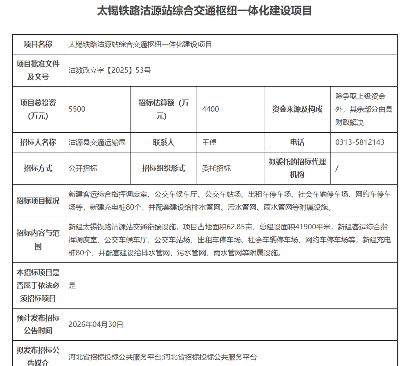 近日,太錫鐵路沽源站綜合交通樞紐一體化建設(shè)項目招標計劃公布。